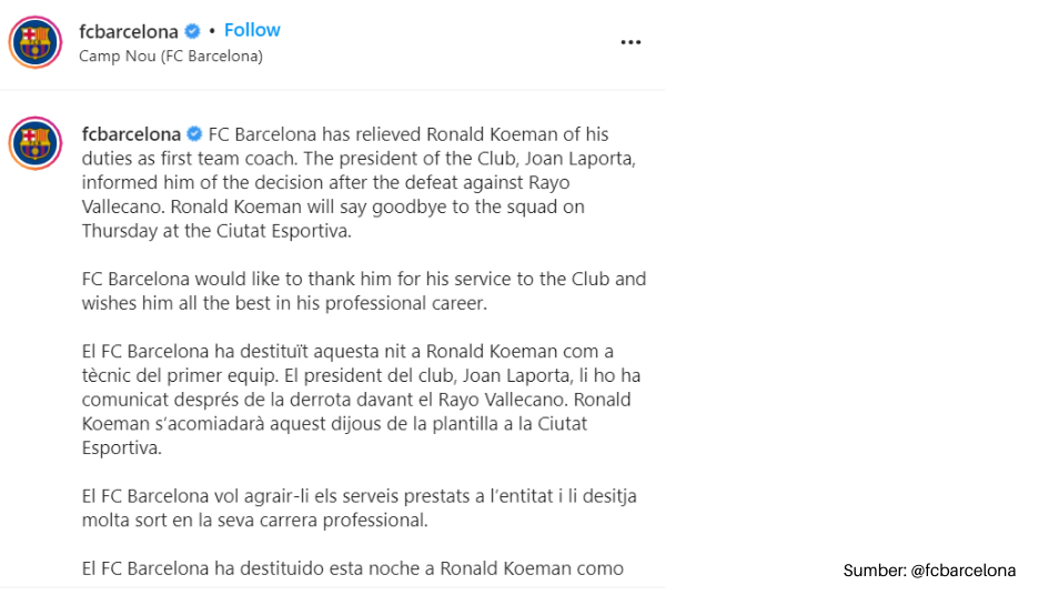 Setelah kekalahan dari Rayo Vallecano, Ronald Koeman dicopot dari kursi pelatih Barcelona. Pelatih asal Belanda itu dianggap telah selesai masa baktinya karena tidak sanggup mengembalikan performa Blaugrana musim ini.